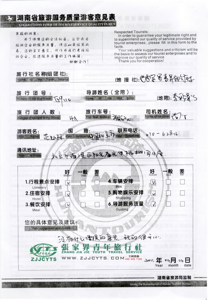 北京海淀區(qū)“范先生”與張家界青旅旅游顧問——曹娟在3月22日取得聯(lián)系,經(jīng)過3次的商談,雙方達成協(xié)議并簽訂了《國內(nèi)旅游組團標準合同》,范先生一行4人于4月2日下午抵達長沙,之后便開始為期4天行程的走進湖南,走進湘西之旅。 此次行程是由我們優(yōu)秀導游——李彩萍,負責旅游接待工作,李導在旅游過程中講解詳細,服務周到,客人玩的很開心、很滿意。