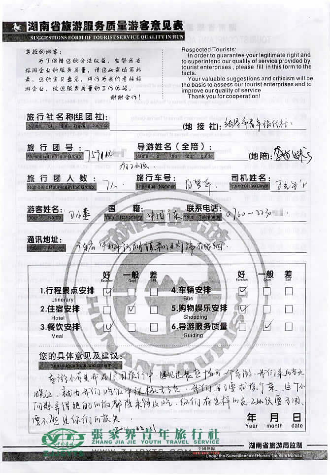 廣東中山市“衛(wèi)先生”與張家界青旅旅游顧問(wèn)——張瑜珂在01月22日取得聯(lián)系,經(jīng)過(guò)3次的商談,雙方達(dá)成協(xié)議并簽訂了《國(guó)內(nèi)旅游組團(tuán)標(biāo)準(zhǔn)合同》,于春節(jié)后自駕車在02月06日中午抵達(dá)張家界,次日便開(kāi)始5天的在湘西過(guò)個(gè)年之旅。 此次行程是由我社優(yōu)秀導(dǎo)游——李世妹,負(fù)責(zé)旅游接待工作,李導(dǎo)在旅游過(guò)程中講解詳細(xì),服務(wù)周到,客人也很滿意。并給予好評(píng)!